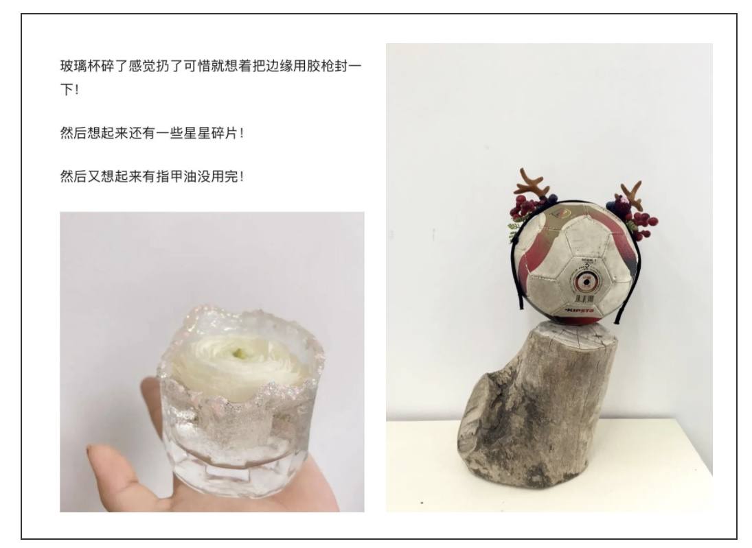 打碎的玻璃杯可以变成烛台、破旧的足球被带上一个可爱的发卡。