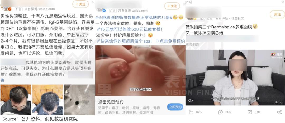微博信息流广告多是O2O等线下客户群体,婚纱摄影、植发、整牙,治痘,微博像互联网上的“电线杆”一样,贴了满满当当的广告。