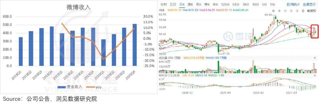 2020Q4,受益于KA客户行业结构调整的业绩拉升,微博的营收增速实现六个季度后的再次转正。