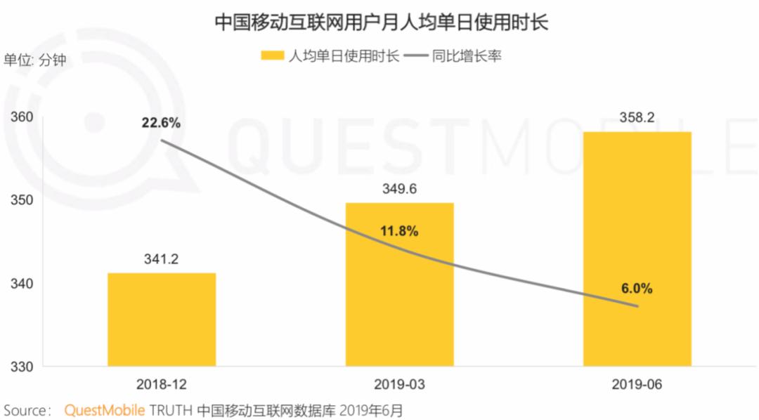 可事实上,中国移动互联网用户人均单日使用时长增速在快速放缓:从2018年12月的22.6%降至2019年6月的6%。