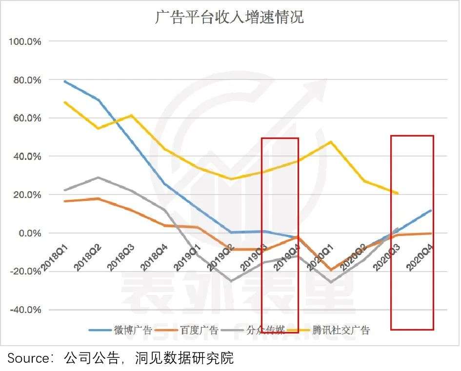 这一幕也曾在2019年下半年上演,但那时(如上图),在分众、腾讯、百度的广告收入增速整体拐头向上的背景下,微博2019Q4的营收增速反而出现下降。