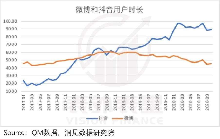 如下图所示,2018年之后,和抖音短视频app用户使用时长的持续上升相反,微博的用户时长出现高点回落降低趋势。