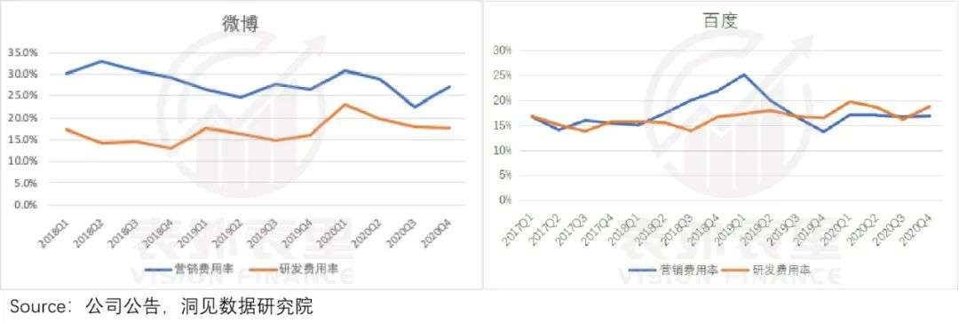 同时,相比研发,微博显然更擅长营销。如下图,微博长期以来的营销费用率,都远高于研发费用率。