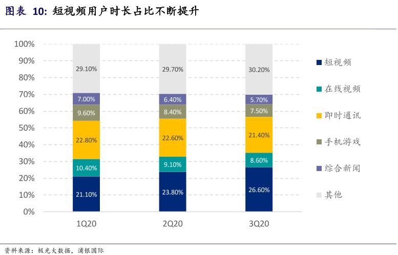 2020Q1-Q3,短视频用户时长占比从21.1%提升26.6%,相比之下,即时通讯、手游、新闻等内容平台的用户时长都出现不同程度的下降。