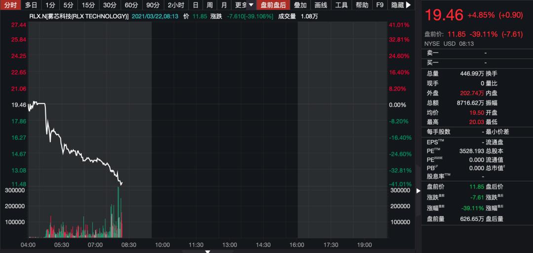 上述《征求意见稿》发布后,电子烟龙头悦刻母公司雾芯科技在美股盘前交易时段大跌40%。