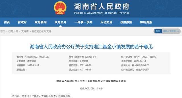 真金实银奖励企业 湖南出台《关于支持湘江基金小镇发展的若干意见》