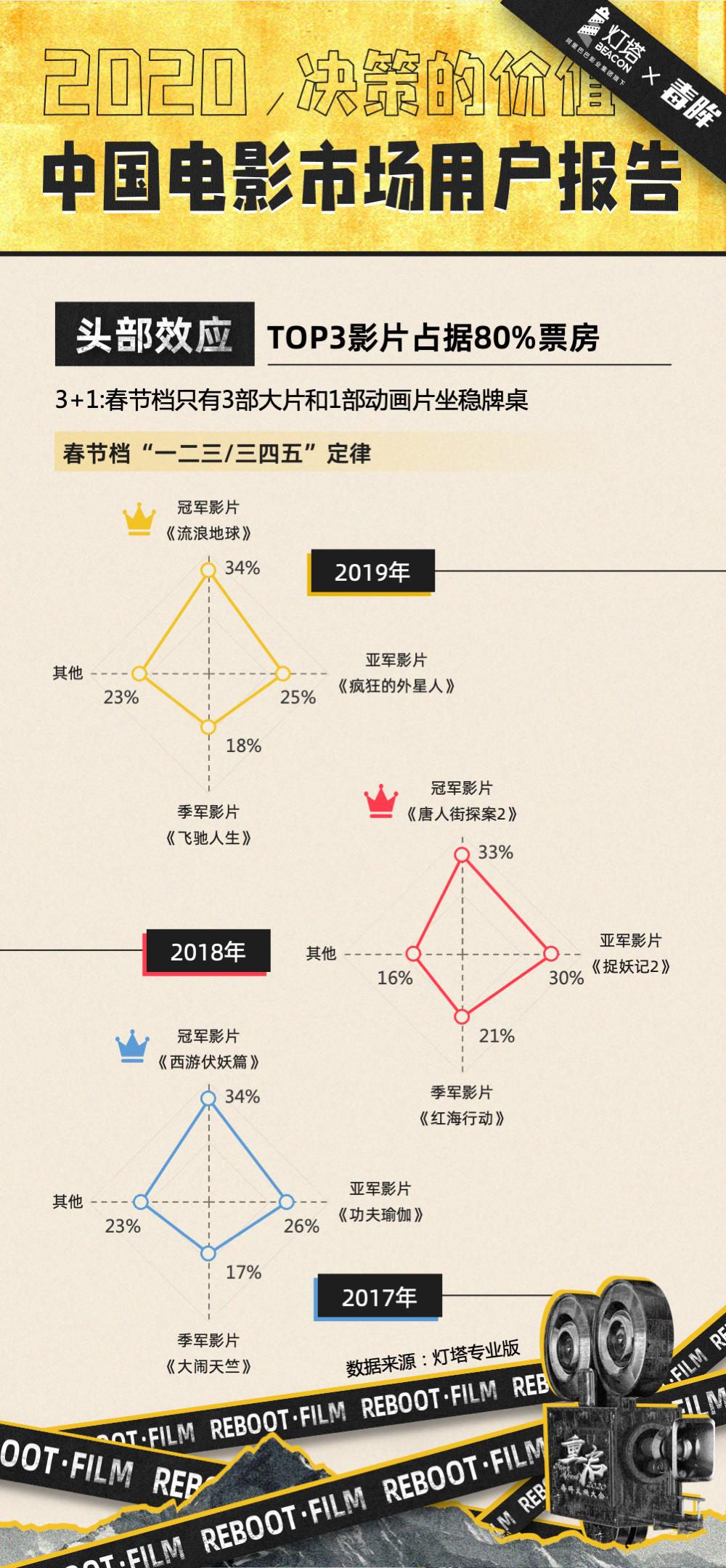 春节档是目前最具竞争力的档期。根据毒眸和灯塔联合发布的《2020中国电影市场用户报告》,春节档通常由3至4部电影瓜分80%的票房,其余电影共同分得20%的票房。