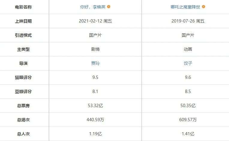 中国电影的观影人次增长在放缓,2019年全年观影总人次为17.27亿,同比上涨了不到1%。2019年《哪吒之魔童降世》观影总人次为1.41亿,今年《李焕英》票房虽超越《哪吒之魔童降世》,但观影人次仅为1.19亿人次。