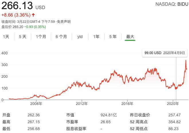 截止今天中午休市,股价上涨0.24%至252.6港元,港股市值为7022.34亿港元。美东时间3月22日,百度在纳斯达克报收于266.130美元每ADS(美股存托凭证),上涨3.36%。