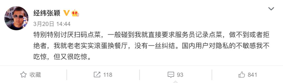 张颖写道,“特别特别讨厌扫码点菜,一般碰到我就直接要求服务员记录点菜,做不到或者拒绝者,我就老老实实滚蛋换餐厅,没有一丝纠结。国内用户对隐私的不敏感我不吃惊,但又很吃惊。”