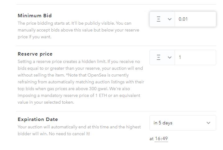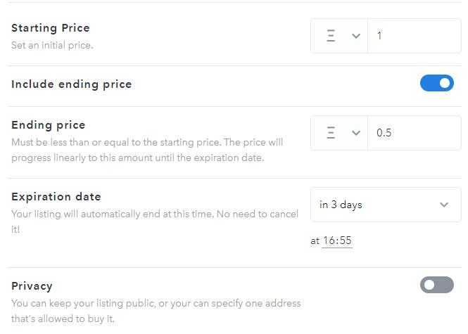 在 OpenSea 上,固定价格还包括一个递减价格的模式:设定好上架期限和最终价格,这样 NFT 上架之后,价格就会慢慢降低,直到期限结束时,价格降低到设定的最终价格——有点类似于清仓甩货的感觉,似乎挺适合硅星人这种首次卖 NFT(极度缺乏自信)的人……