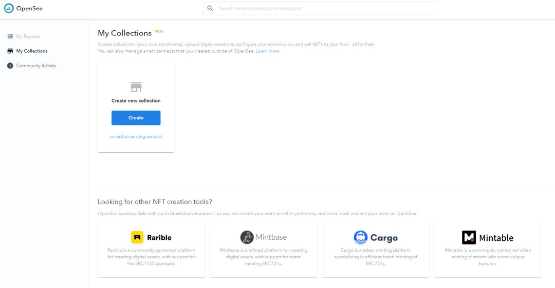 无论是 OpenSea,还是这个页面下方列出的 Rarible、Mintbase、Mintable、Cargo 等,都支持 NFT 相关的以太坊区块链标准,可以把作品 mint 成一个 NFT。用户可以直接在 OpenSea 上创建,也可以导入在其它平台上创建的 NFT。