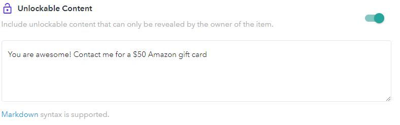 不仅如此,上架的作品还可以增加一个“可解锁内容”。这个内容可以是一份特殊的礼物,也可以是一段话,或者一个文件。它对其他所有人都是隐藏的,只有成功买到它的人才可以看到。