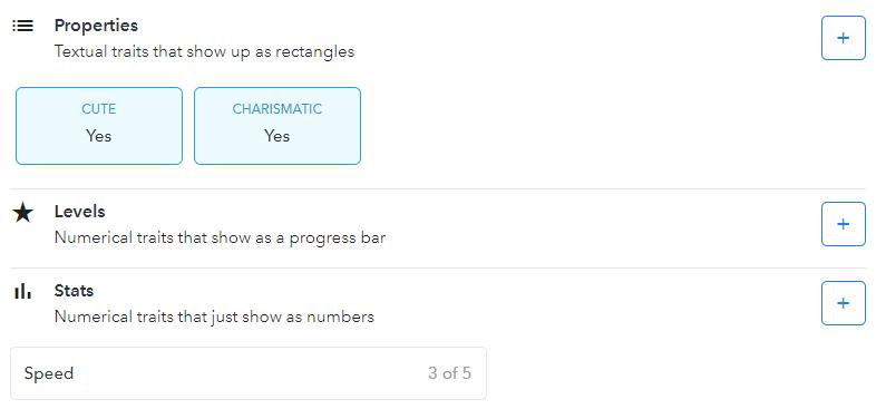 除了这些基本信息之外,我们还可以给这个作品添加一些“属性”,就像《精灵宝可梦》等游戏里那样,比如“移动速度”、“幸运值”、“魅力”之类的。这是因为在此之前 NFT 经常被用来制作和交易收藏卡片,比如数码宠物、虚拟体育明星等等。