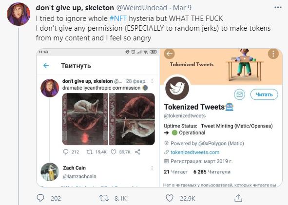 俄罗斯艺术家 Greta (Twitter 账号 @WeirdUndead) 最近就发现,有人未经她的许可将她发表在 Twitter 上包含作品的推文变成 NFT,放到 OpenSea 上出售。