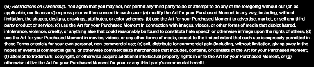 比如 NBA 就在通过 NFT 的方式出售赛场的精华短视频 (moments),在使用条款当中就有专门注明,购买者被禁止对这些 NFT 进行修改、移除版权、商业使用,并且不得以 NBA 认为对其名誉有损害的方式去展示和使用它们。