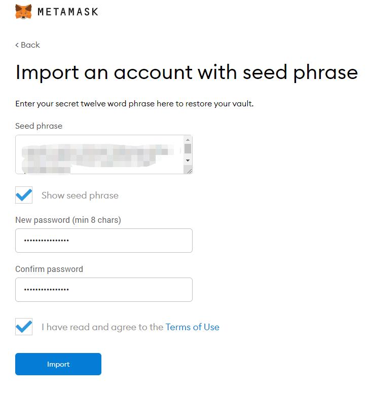 MetaMask 是 ETH 以及 NFT 交易常用的一个钱包服务,巧的是,前几年加密猫 CryptoKitties 火的那段时间硅星人也玩过,当时它建议使用的钱包就是 MetaMask。于是我去把老电脑里备份的助记词 (seed phrase) 找出来,填写进去,就恢复当时创建的账户了: