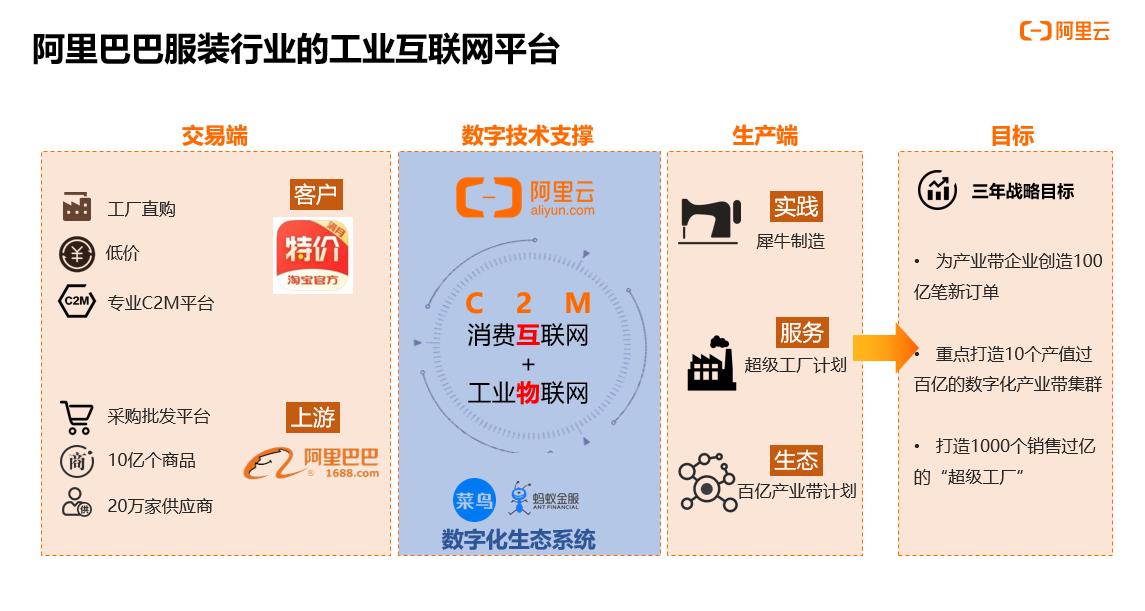 从电商业务出发,过去几年,阿里云沉淀了数字化的能力,并不断把数字化的能力向产业链上游拓展。在服装行业,我们已经形成了完整的工业互联网的雏形。形成服装订单之后,在接入犀牛制造平台的各工厂之间,订单可以根据工厂的产能剩余、加工能力和原材料储备情况自动分配,工厂接到订单之后利用制造犀牛平台的能力自动排产排程,实现小闭环高效协同、快速交付;最后产品物流供应链上有覆盖全国骨干网的菜鸟;在这之上蚂蚁金服能够基于全链路的大数据风控为工厂、品牌商提供金融服务。当我们再把服务延伸到服装加工的上游,到布料、到纱线就形成了一个比较完整的工业互联网体系。2020年4月阿里巴巴公布的“春雷计划”又着重强调了“数字化产业带”建设,目标是在全国打造10个产值过百亿的数字化产业带集群,三年内打造1000个线上直销产值过亿的超级工厂,目的就是繁荣在平台上的供给端生态,并围绕产业集群和工厂,提供越来越丰富的制造能力方面的服务,最后一定会重构服装产业链的格局和利益分配,并衍生出新的商业模式。