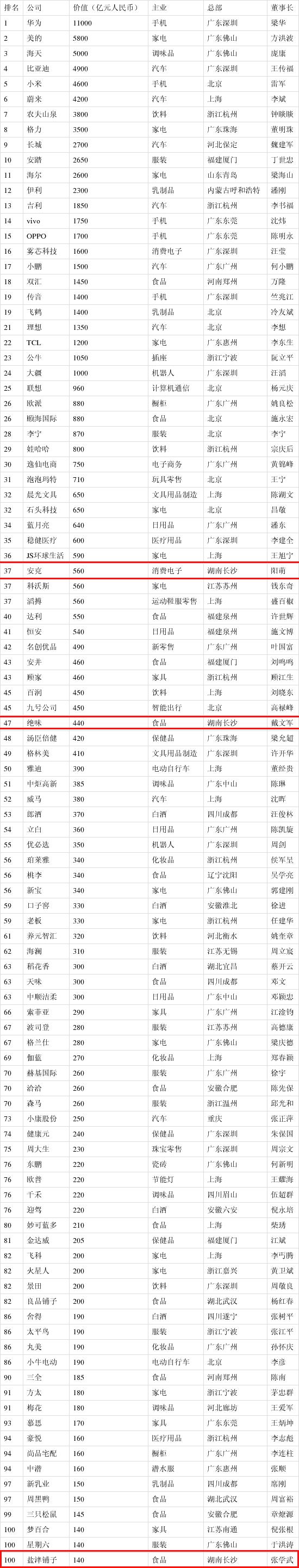 榜单显示,华为以1.1万亿价值成为中国大消费领域价值最高民营企业,美的以5800亿元价值位列第二,海天以5000亿元价值位列第三,比亚迪以4900亿元价值排名第四,小米以4600亿元价值排名第五。蔚来、农夫山泉、格力、长城、安踏依次进入前十。
