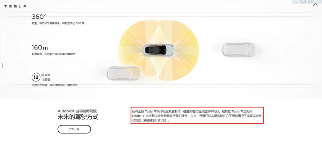 除了口头的宣传,在特斯拉官网的辅助驾驶功能介绍界面,同样向消费者营造着可以实现自动驾驶的幻觉。