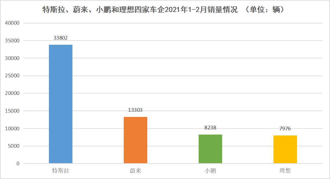 特斯拉、蔚来、小鹏和理想四家车企2021年1-2月销量情况,数据来源于乘联会,连线出行制图