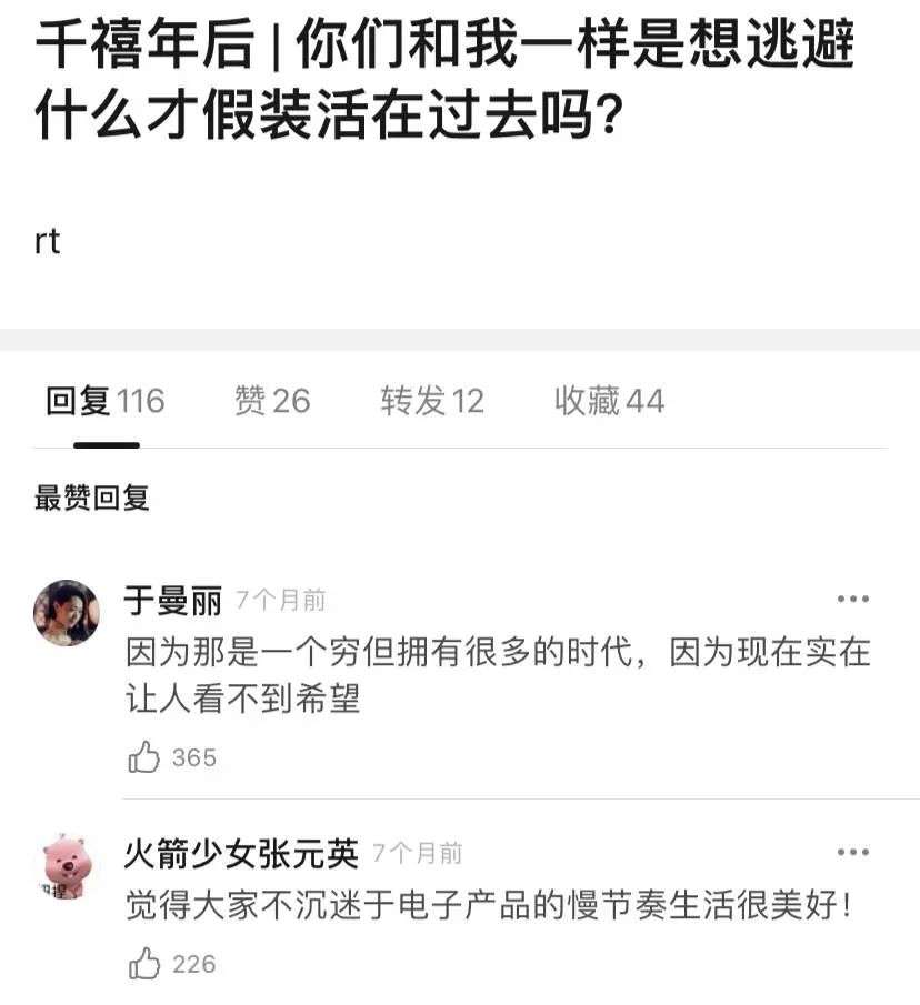德国科隆大学的调查发现,怀旧带有一点”防御”性质,它能帮助人们“屏蔽”一部分内疚或羞耻之情。所以,在“假装活在1980-2000”豆瓣小组中,用户haaaaaaa的帖子”你们和我一样是想逃避什么才假装活在过去吗?”能够引起了两百多人的共鸣。