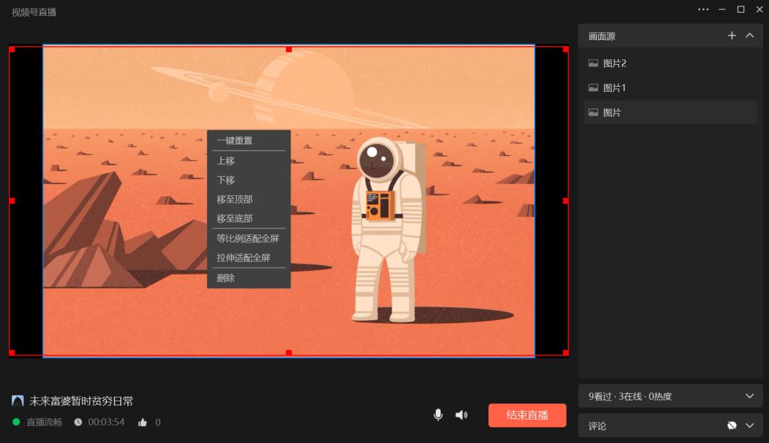 在 Windows 端的视频号直播间里,主播还可以对画面源进行组合搭配。画面源可以进行上移、下移、适配全屏、隐藏画面源等操作。如果使用得当,主播完全可以用不同的画面源打造一个「新闻直播间」,将想要传达的内容都通过多媒体组合的方式呈现出来。