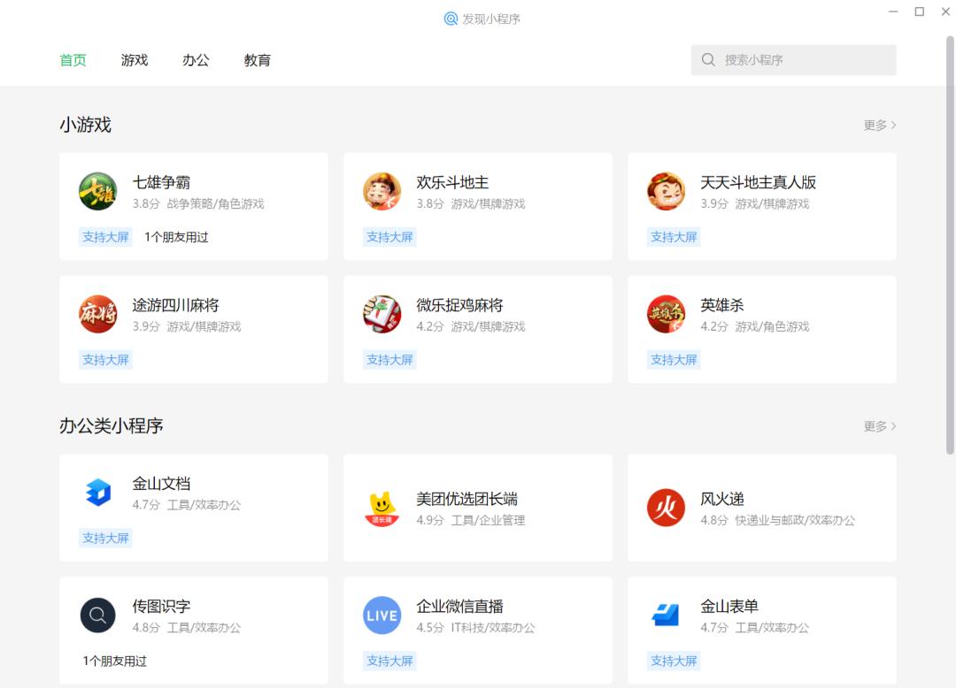 点击小程序图标就能看到和手机下划类似的小程序页面,除了最近使用、我的小程序,这里还多了一个「发现小程序」的页面。点击「发现小程序」,就能看到游戏、办公、教育三个版块的小程序推荐,让你在这里也能接触到新的小程序。