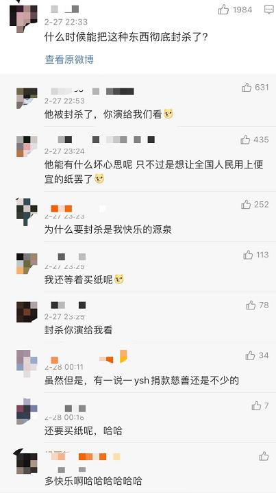 出乎意料的是,这条评论下很多人表示“为什么要封杀我的快乐源泉”“封杀了你演给我们看”“我还等着买纸呢”……