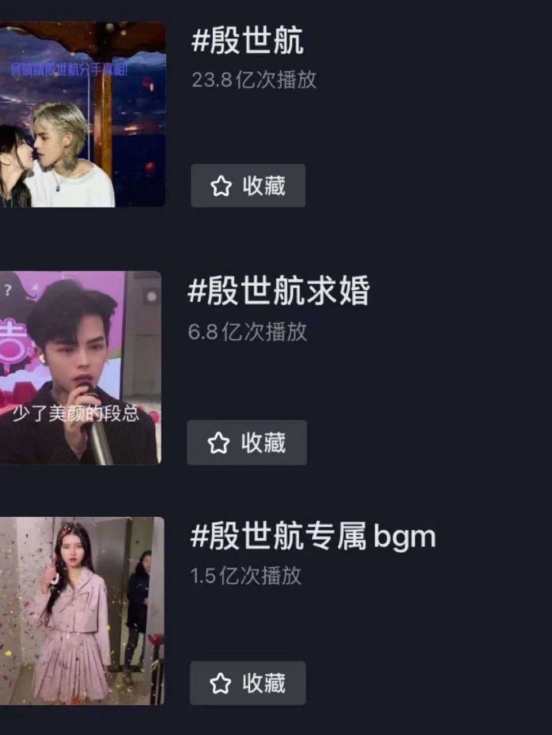 就连殷世航求婚时用的BGM都有一个#殷世航专属BGM 的话题,播放量已经达到1.5亿次,每次一有人用这首BGM,评论区一定有“殷世航:你们自己没有BGM吗”这样一句调侃。