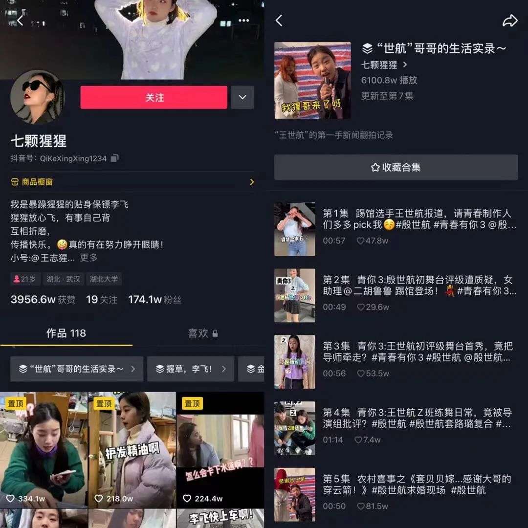 抖音粉丝158.9万的“七颗猩猩”专门建了一个标题为《“世航”哥哥的生活实录》的视频合集,目前一共有7条视频,每条视频都是翻拍殷世航的内容,累计播放量已经达到了6100万。
