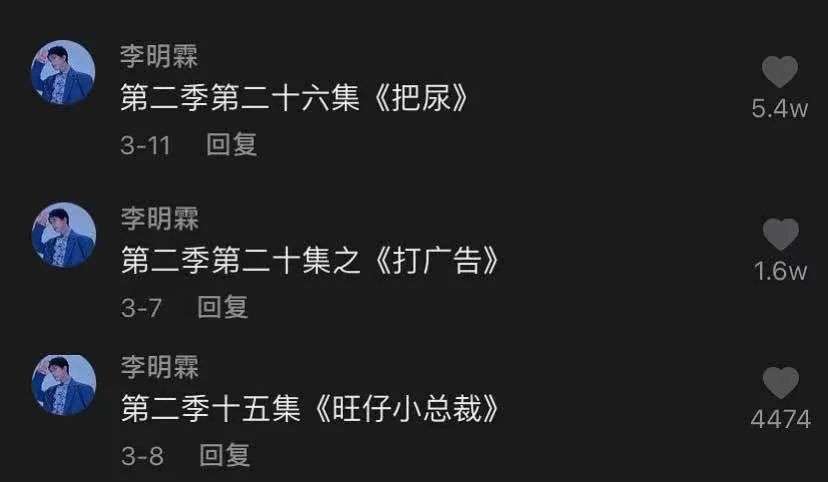 他的抖音视频下有个叫“李明霖”的网友,一直在留言为每一条视频取剧集名称,比如“第二季第二十集之《打广告》”“第二季第十五集《旺仔小总裁》”。