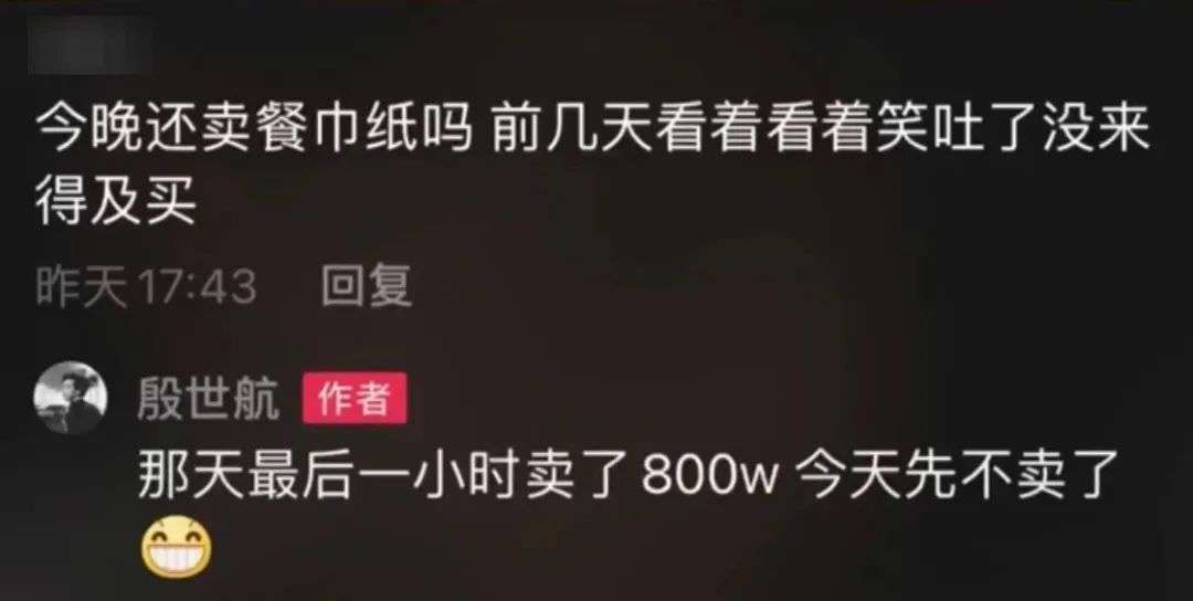 据殷世航本人透露,卖纸环节卖了800多万元,以至于到后来他再直播,不卖纸都有人不敢相信,一直喊他快点继续卖纸。