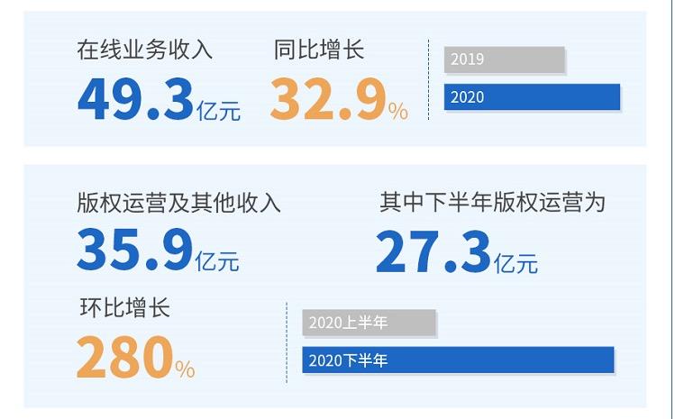 首先是阅文集团的在线业务。财报显示,阅文2020年在线业务收入达到49.3亿元,较2019年同期增长32.9%。在线业务作为阅文集团的“基本盘”,这个增幅是有些出人意料的。