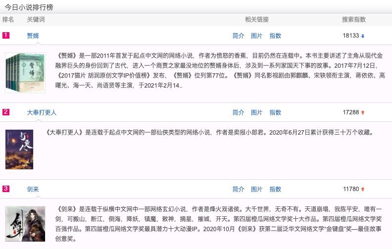 据了解,截至2020年底,阅文平台上作家累计超过900万,作品总数达到1390万部,全年平台新增字数约460亿。今年2月的百度小说风云榜中,排名前30部的网络文学作品有《赘婿》《大奉打更人》等26部出自阅文平台。