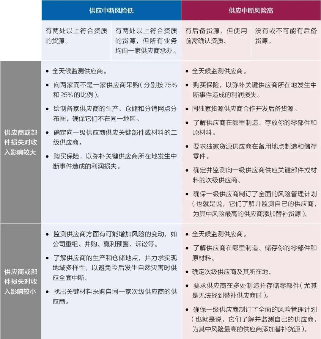 我们建议,公司至少要在意外打击降临之前制订一项风险管理计划。针对各种不同的突发事件制订应急计划后,运营团队就能够迅速反应,并有望减轻供应中断造成的影响,缩短其持续的时间。如果能至少为一级和二级供应商找到第二货源,然后积极利用这些资源,那当然更好。