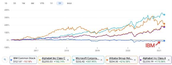 过去5年间,纳斯达克指数增长了175%,亚马逊股价增长了182%,微软增长了337%,阿里巴巴增长了216%,只有IBM反通胀周期,股价反而降了10%。