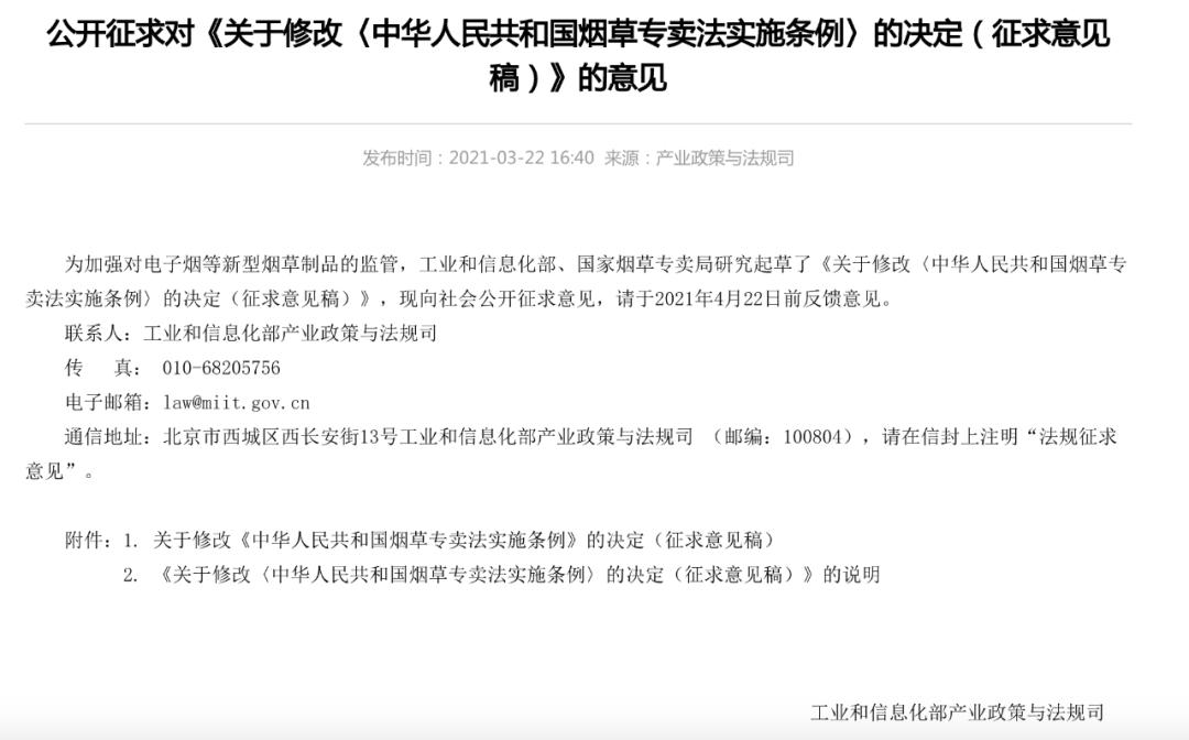 3月22日,工信部就修改《中华人民共和国烟草专卖法实施条例》公开征求意见,拟在附则中增加一条,作为第六十五条:“电子烟等新型烟草制品参照本条例中关于卷烟的有关规定执行。”