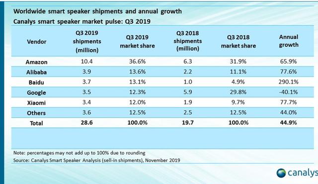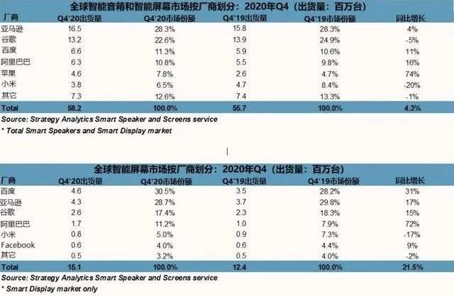 在2020年第四季度,亚马逊以28.3%的市场份额引领智能音箱市场,Google以22.6%的市场份额排名第二,其后分别是百度(11.3%)、阿里巴巴(10.8%)、苹果排名第五,市场份额为7.8%。