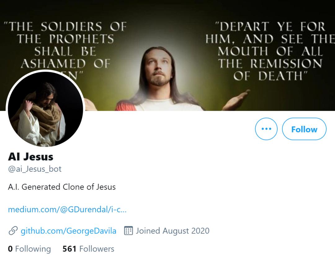 目前,这个AI耶 稣也拥有了自己的Twitter账号,还有561位关注者。