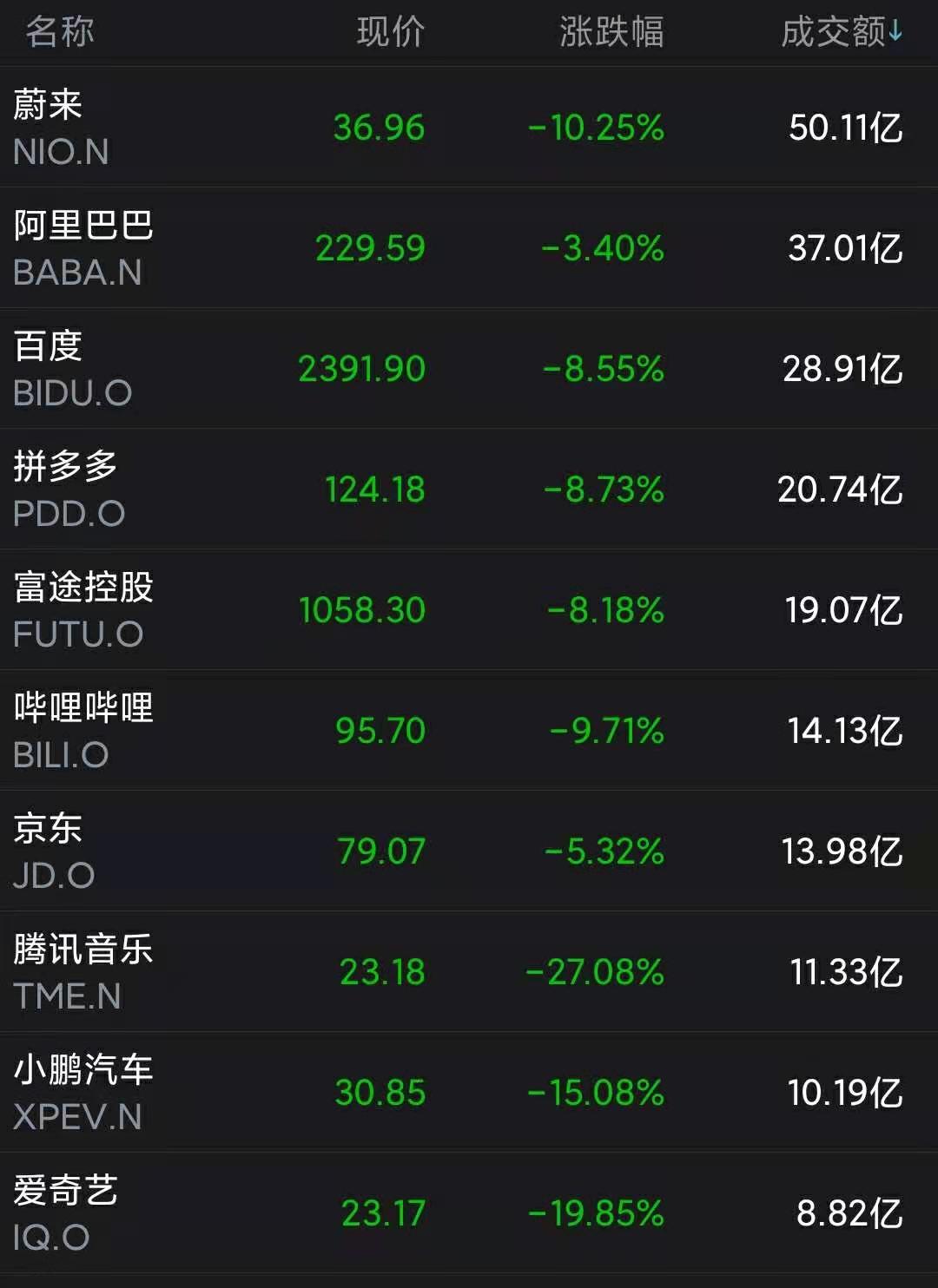 在24日美股成交量最高的20只股中,包括三家中概股,分为为蔚来(-10.25%)、阿里巴巴(-3.4%)和百度(-8.55%)。