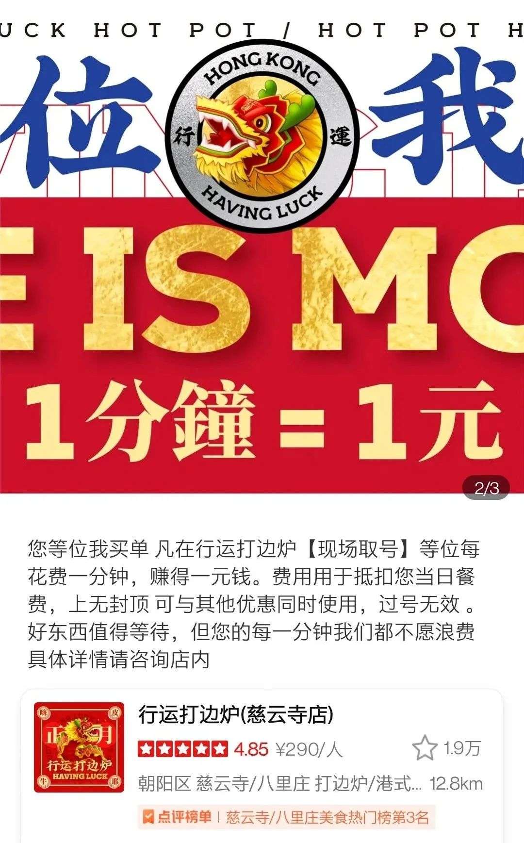 我们选的餐厅是一家新开的港式火锅,叫行运打边炉。领号时,前面还有10桌在等位。但是服务员告诉我们,今天等位的时间可以直接兑换成金额,一分钟一元钱。