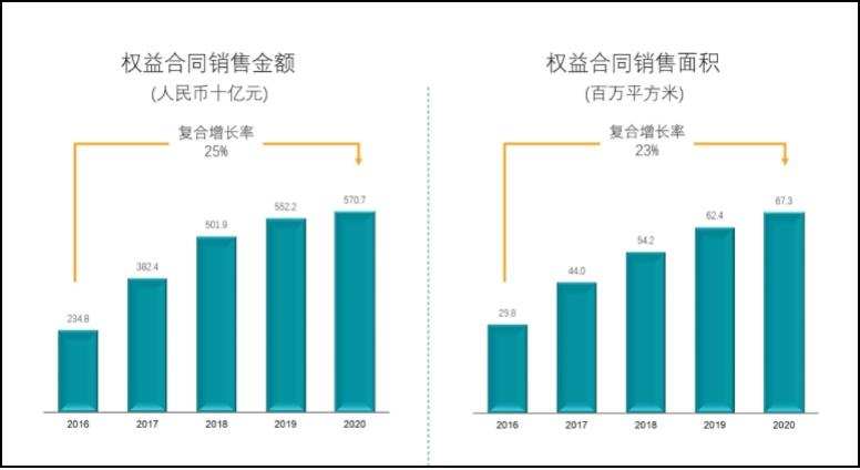截至去年12月31日,碧桂园集团连同其联合营公司,共同实现归属于集团股东权益的合同销售额约为人民币5706.6亿元,合同销售面积约6733万平方米。无论权益销售金额还是销售面积,都继续保持了同比稳步提升。在第三方机构的统计中,碧桂园仍保持全口径销售额行业第一的领先地位。统计显示,2016年至2020年期间,公司权益合同销售金额复合增长率达到25%。
