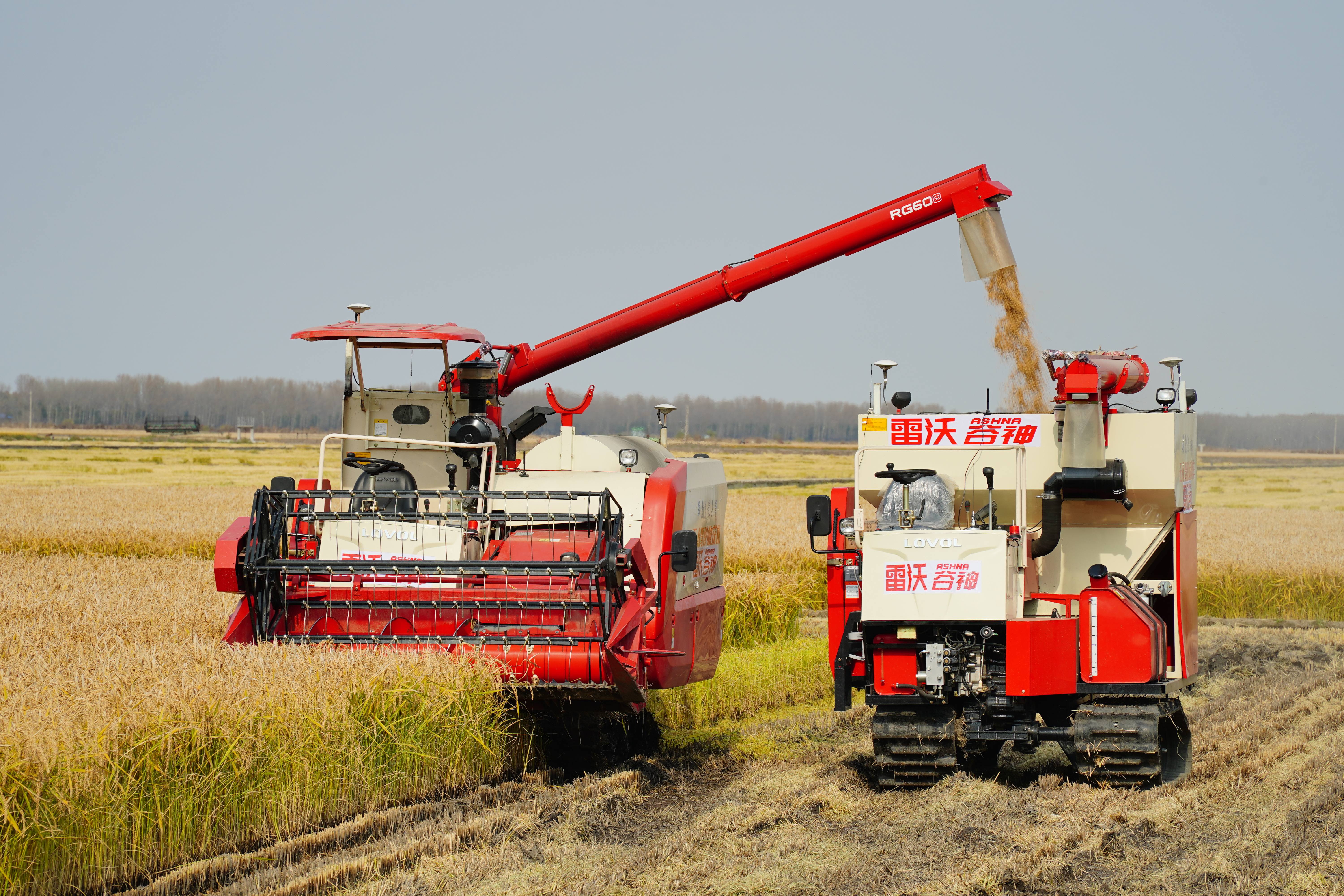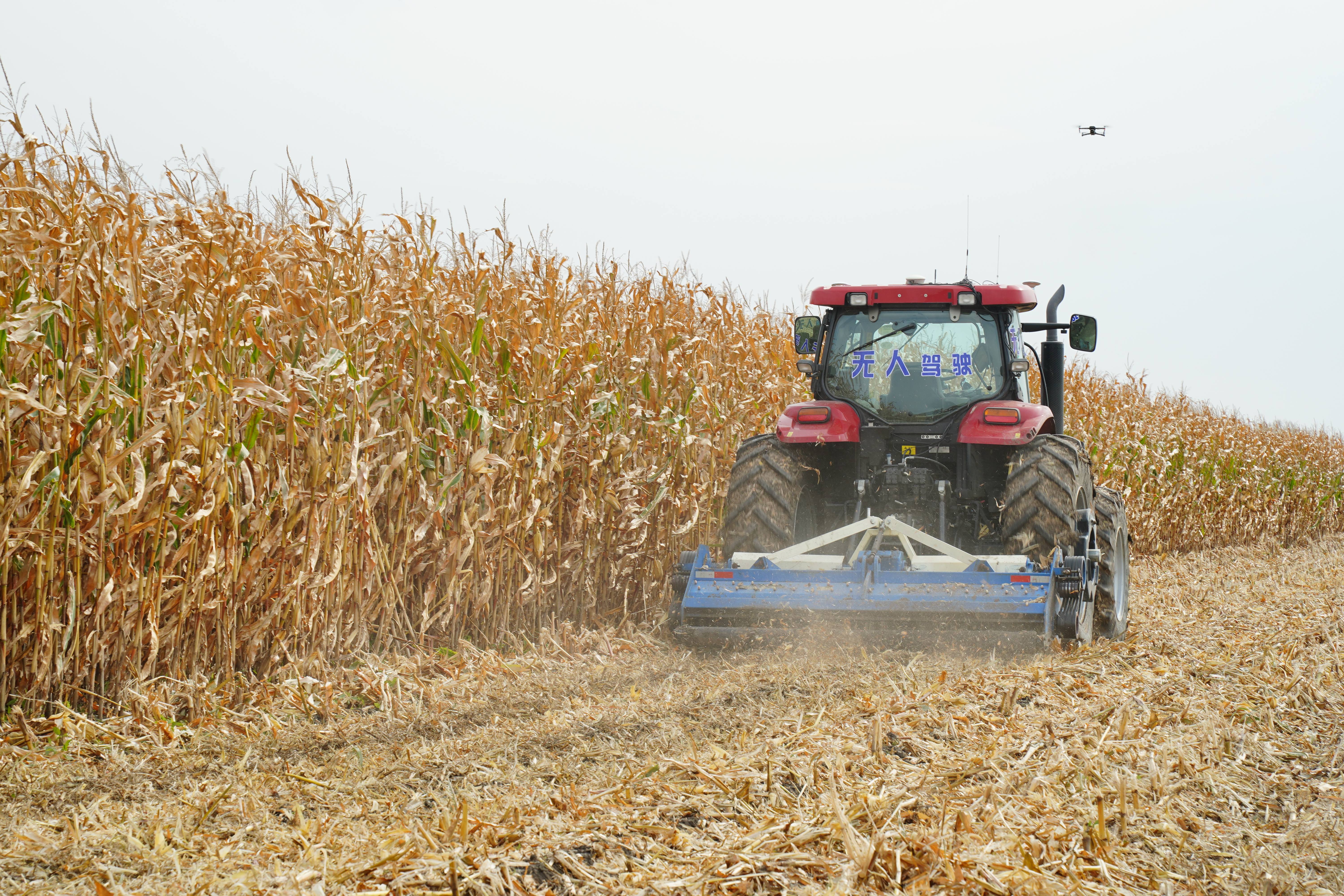 无人驾驶收割机和无人驾驶运粮机展示协同作业技能,正在进行运粮