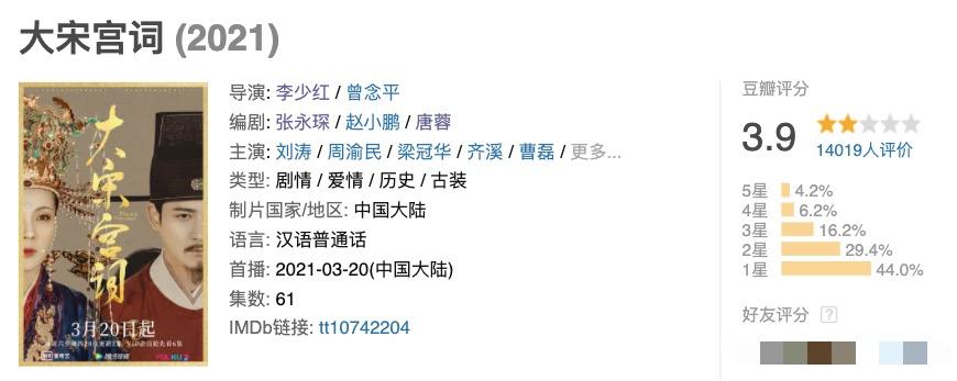 3月20日晚,延播两年后,由李少红执导,刘涛、周渝民领衔主演的古装剧《大宋宫词》终于播出,然而当晚豆瓣开分6.1,令许多剧粉大失所望。随后两天内,微博话题#大宋宫词评分暴跌#的阅读量累计高达1.4亿,完全盖住了剧集本身推广话题的风头。