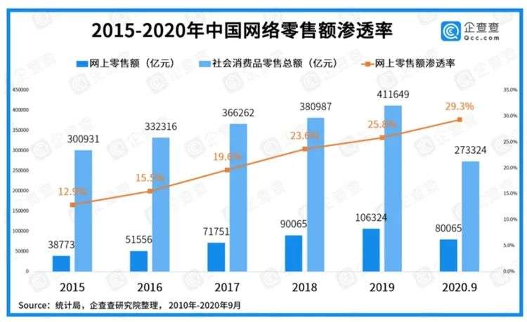 同样从数据来分析,我国的电商渗透率,从2015年的 8.3%水平,提高到2020年9月的 29.3%水平,网络零售额规模超8万亿元。而这一数字本在2019年趋于放缓,但疫情的爆发反向促使渗透率上升。