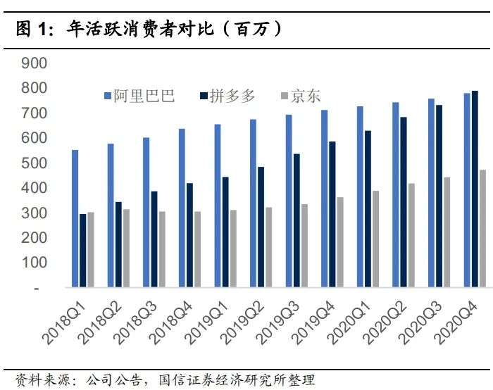 最新一季度的财报显示,拼多多以7.88亿年活跃买家数超过阿里巴巴的7.79亿。