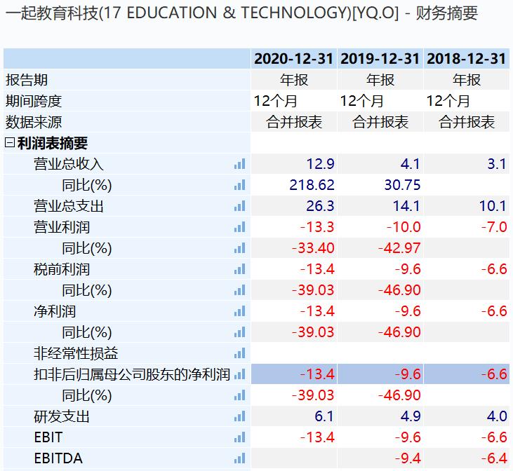 一起教育(NASDAQ:YQ)。它的亏损幅度非常离谱,过去3个财年:6.6亿亏损换3.1亿营收,9.6亿亏损换4.1亿营收,13.4亿亏损换12.9亿营收。你可以说亏损在改善,但“进步快”(如果这能算进步的话)源于极低的起点。