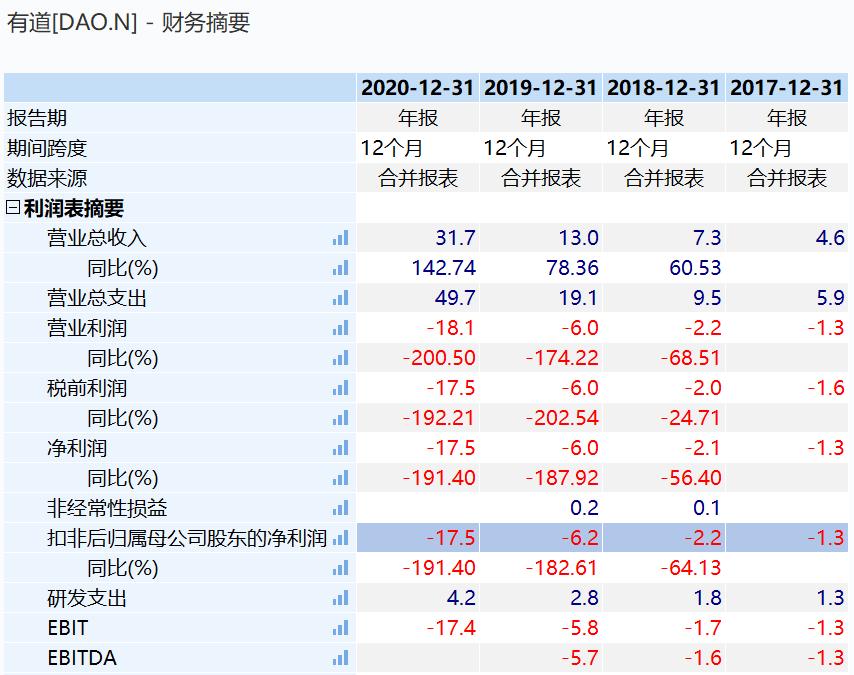 网易有道(NYSE:DAO),2017-2020年,亏损额从1.3亿元上升到17.5亿元。基本是拿亏损换营收的节奏。1.3亿亏损换4.6亿营收,2.2亿亏算换7.3亿营收,6.6亿亏损换13亿营收,17.5亿亏损换31.7亿营收,未完待续……