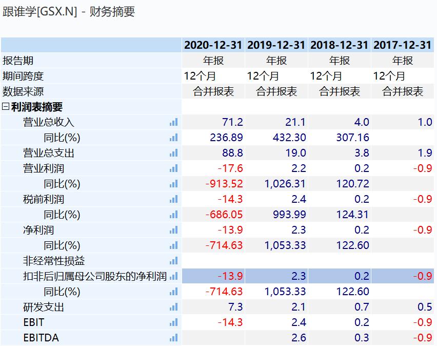 跟谁学(NYSE:GSX)。2017-2019年,还基本保持盈亏平衡且营收快速增长的节奏;但2020年的它,不再“孤僻”自成一体,亏损达到13.9亿元,融入了亏损换营收的在线教育大家庭,一家人整整齐齐。后续报告我们会专门分析跟谁学的变化意味着什么。